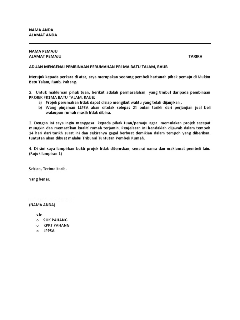 Mar 23 2020 lili mengunjungi geetha yang. Check defect rumah rekapasang perabot gril dan loteng. Contoh surat aduan kerosakan rumah kepada pemaju.